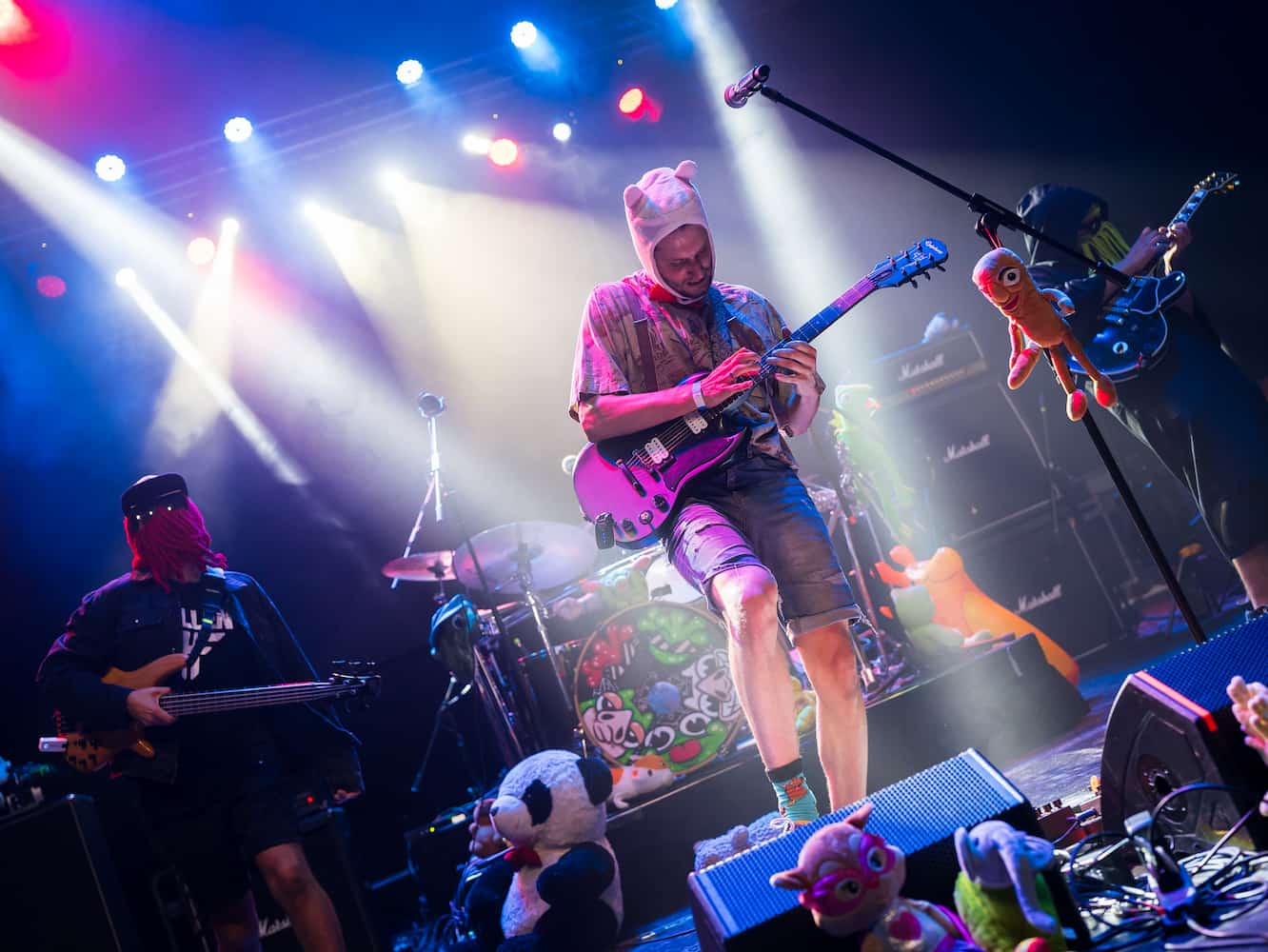 Unos pocos minutos antes de las 19:50 hrs., los integrantes de Matar a Grax fueron directo al hueso: desorden, excentricismo y canciones que alternan lo caótico con lo pulcro. La ambientación, típica de la banda, ya vaticinaba esta particularidad teatral e irónicamente infantil, con peluches de Bilz y Pap, gorros de animales, de cthulhu y el uso de inflables para lanzar al público y motivar los primeros mosh pits de la jornada. Es así que el show desató la violencia “con amor” desde temprano, logrando sentirse cercanos con les asistentes a través de interacciones entretenidas entre ellos y con la gente, además de poder escuchar adelantos de sus próximos lanzamientos, al parecer, agendado para dentro de un mes.